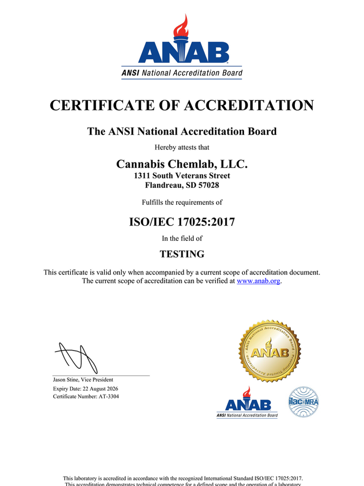 In summary, ISO/IEC 17025 accreditation demonstrates Cannabis ChemLab's commitment to maintaining the highest standards of accuracy, reliability, and quality in its testing services, ensuring clients receive trustworthy and consistent results.